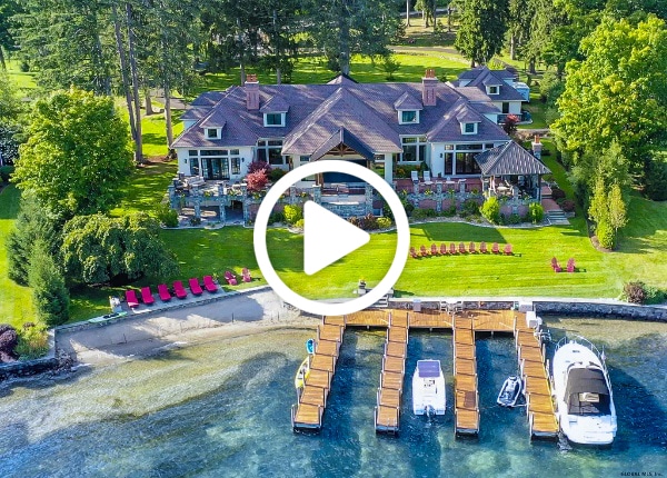 Walking into the main door, you will be in awe of the resort-style architectural design and spacious layout. The main floor features a smaller living room with a piano that leads into a 1,600-square-foot open-concept living room with stunning panoramic views of Lake George everywhere you look. This expansive room boasts three distinct living areas: an oversized sectional with two bar tables overlooking the lake, a cozy TV area with a fireplace and wet bar with an ice maker and wine fridge, and a round dining table for six alongside another stone fireplace. Off of this room is the exercise room with a stair climber, rogue air bike, and more. Walking through the arched entry into the kitchen, you will find a dining room table with 8, a breakfast nook with 6, a wood-burning fireplace, and perfect views as you cook up your favorite meal. This gourmet kitchen has a 6-burner range, two dishwashers, two sinks, reverse osmosis filtered water, a large center island, a wine rack, and a TV. From here, you walk out onto the lakeside balcony that runs the entire length of the house and features a cabana, fireplace, BBQ grill, wine fridge, and plenty of seating areas. Next to the kitchen is a half bath. You will find two bedrooms on the main floor’s North wing. One bedroom features a king bed and a full bath, while the other features a queen bed with a full bath. The South wing of the main floor features a queen bedroom with a full bathroom and jacuzzi tub. Attached to this bedroom with its private entrance is another bedroom with a queen-over-queen bunk bed. You will find the laundry room and another full bathroom with a walk-in shower in the hallway. The last bedroom on the main floor is the master king, with a four-poster bed, floor-to-ceiling windows, a walk-in closet, a walk-out balcony with furniture, and a primary bathroom with a double vanity and walk-in rain shower.